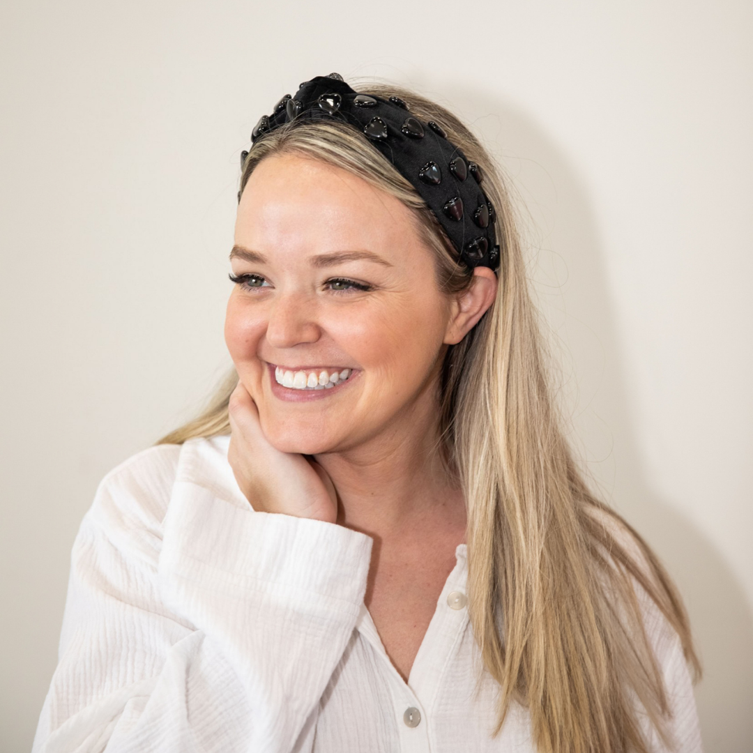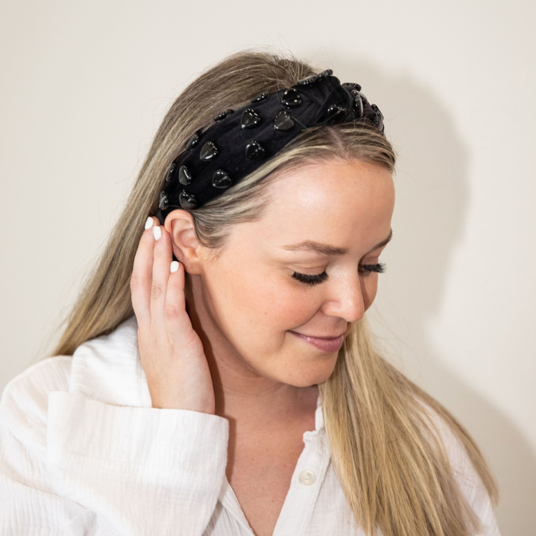 Stylish, yet classic, this black velvet Stone Quartz Traditional Knot Headband will tie any look together! Securely and comfortably nestled in the velvet fabric are sewn on heart stones that will make your outfit sparkle and shine! Perfect for a special occasion or for everyday wear!