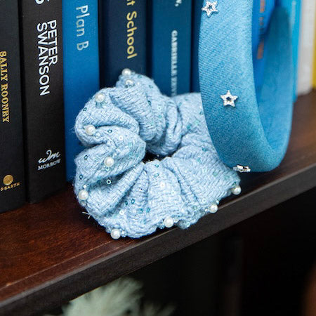 Softly neutral, the Sequin Pearls Tweed Scrunchie Set of 3 introduces relaxed refinement. Slim padding shapes the hair with subtle precision. A natural complement to denim, knits, or silk alike. The detail that shifts everyday dressing upward.