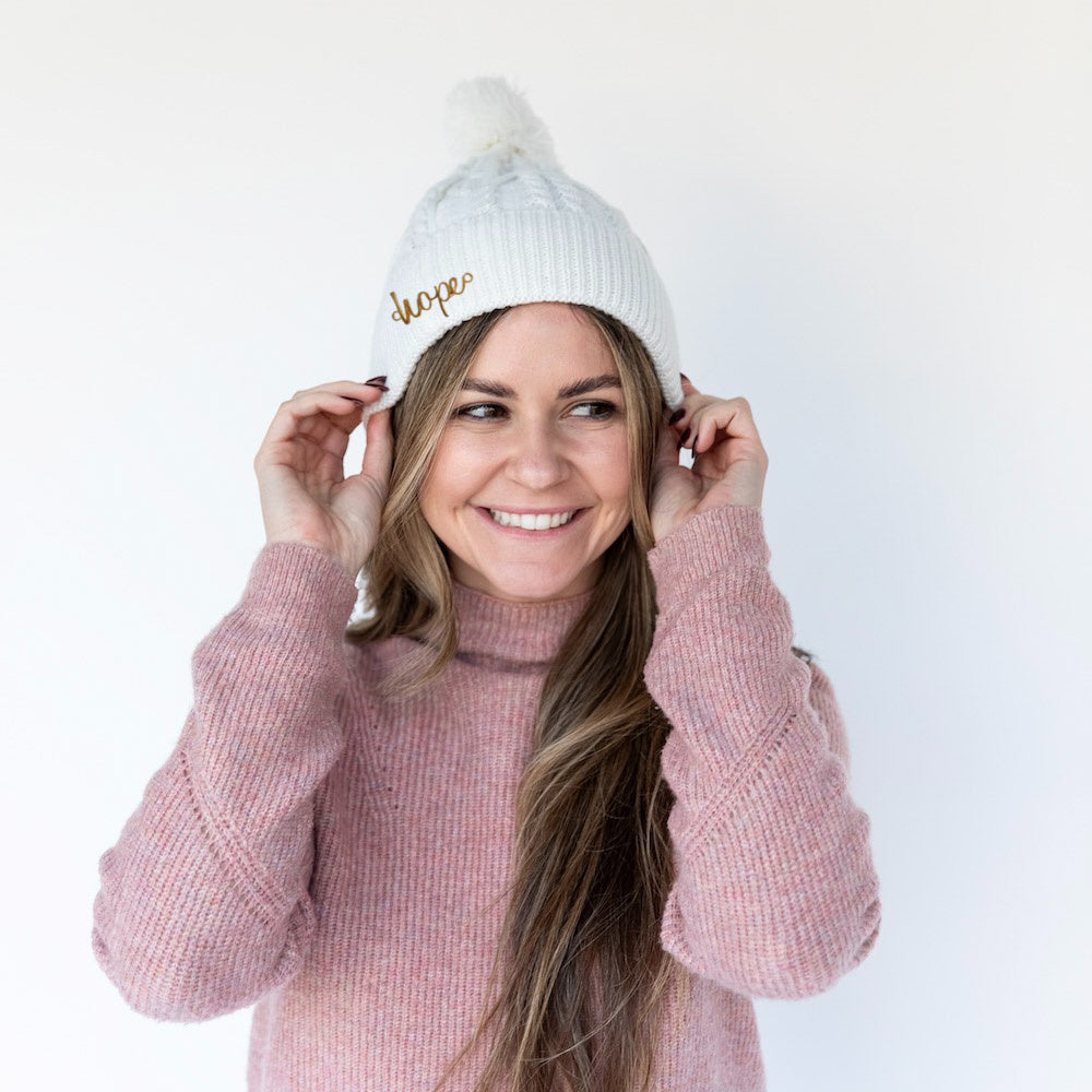 Soft, classic, and effortlessly cozy. This ivory cable knit pom pom beanie brings timeless winter style with a warm, neutral tone that pairs with everything. The textured cable knit adds beautiful dimension, while the fluffy pom pom gives it a playful finish. Complete with a metal hope detail sewn onto the cuff, it is a cold weather essential that looks good and gives back.
