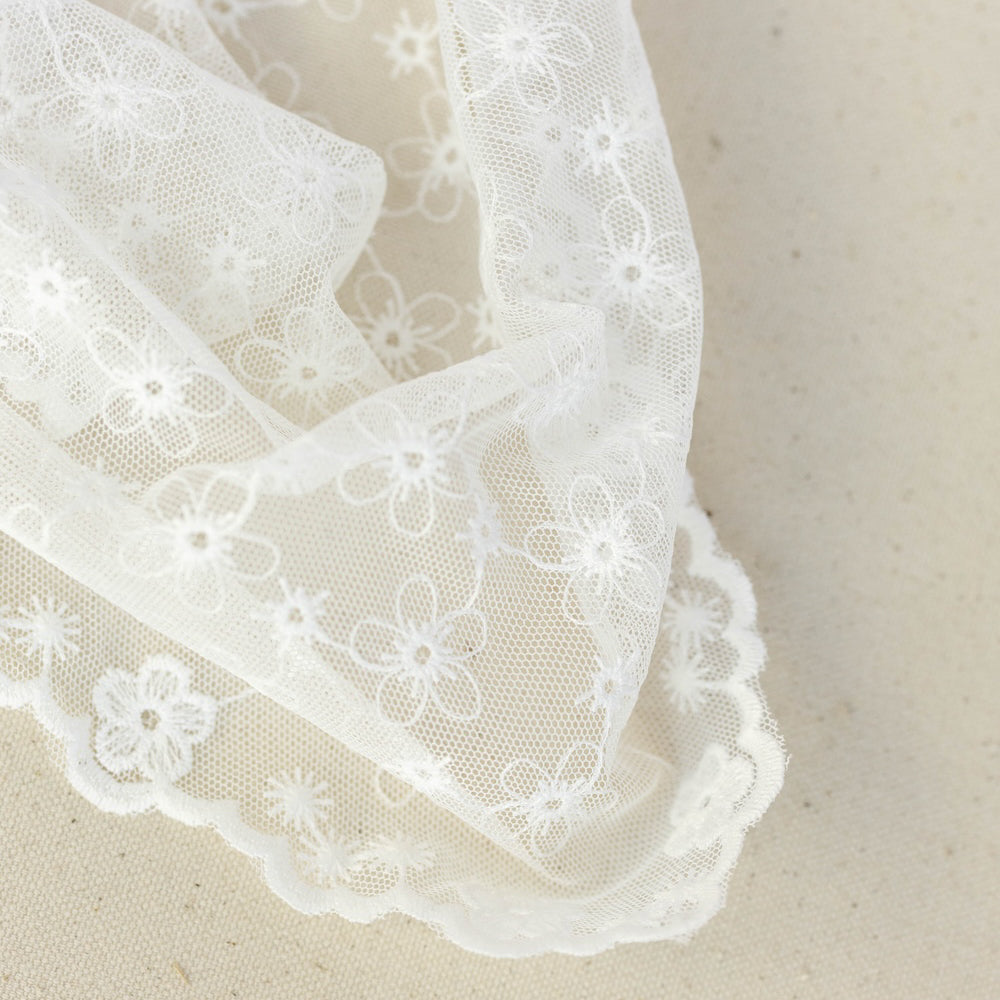 - Delicate white lace headscarf with all-over floral embroidery