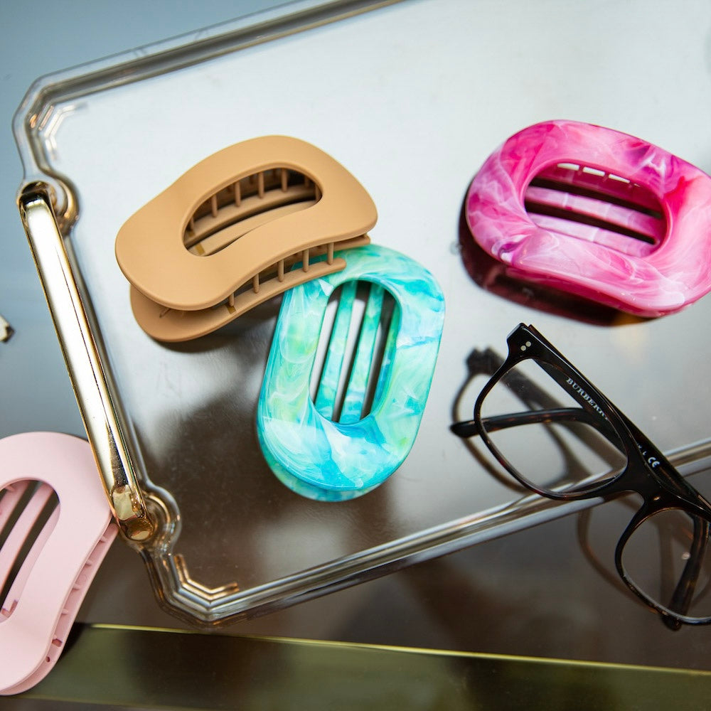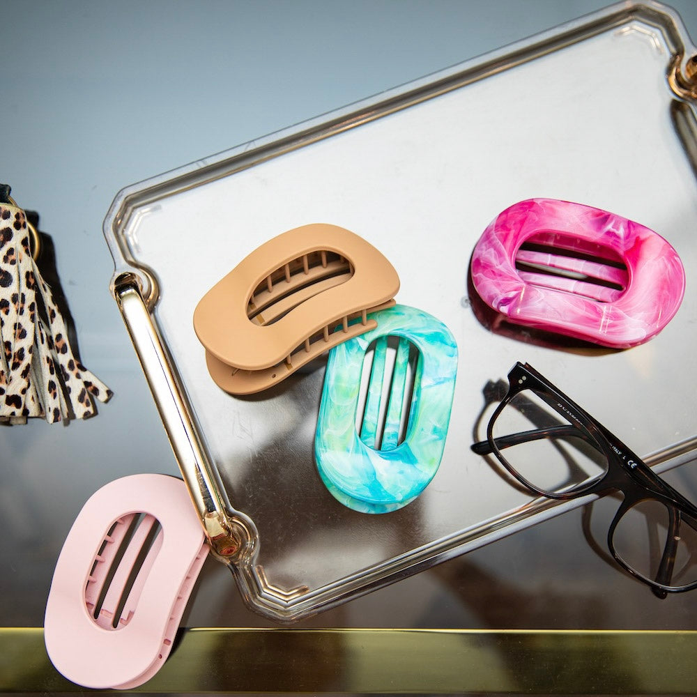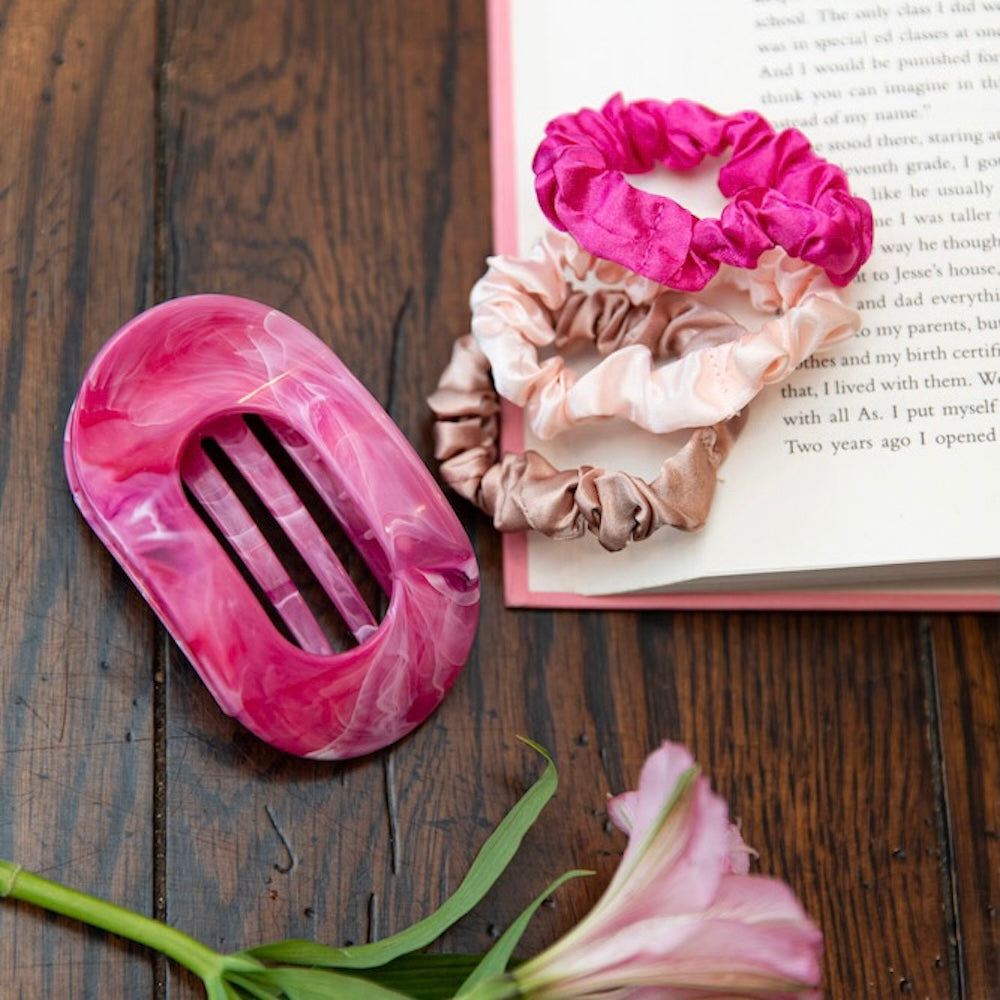 This two-piece claw clip set brings a playful yet refined touch to everyday styling. Featuring one soft pink clip and one glossy pink marble clip, the duo offers both subtle charm and standout shine. The large oval silhouette ensures a secure hold that works for a range of styles, from quick buns to effortless half-up looks. Fashion-forward and functional, these clips make it easy to refresh hair looks with color and style.