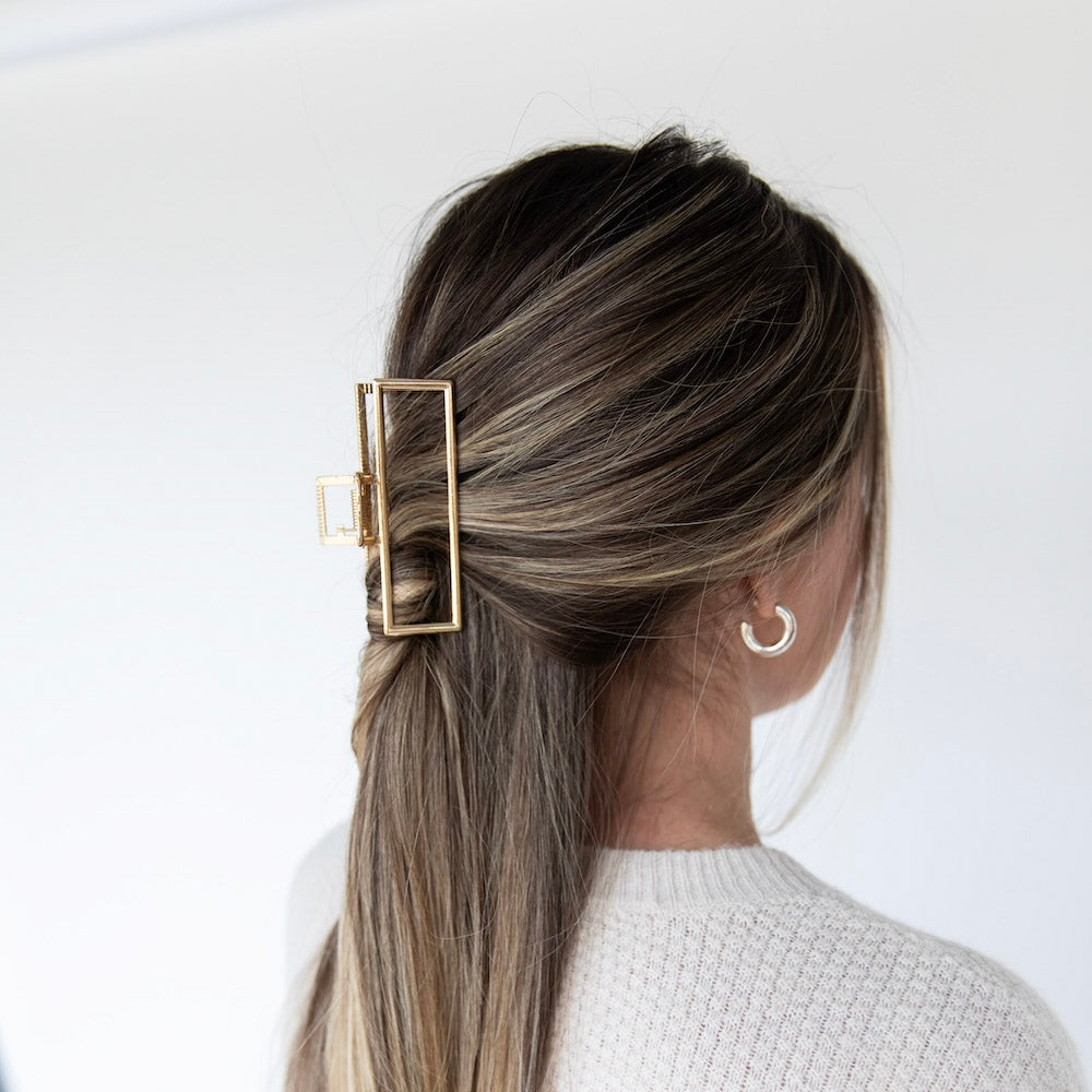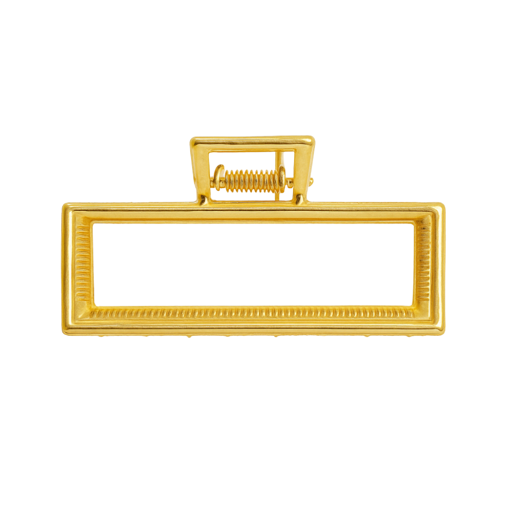 This medium rectangle claw clip in polished gold metal is the perfect mix of modern style and everyday function. Designed with a sleek rectangular shape, it offers a strong grip that holds hair in place with ease. Lightweight yet durable, this clip transitions seamlessly from day to night. Ideal for quick updos, half-up styles, or adding a touch of shine to casual looks. Its minimalist design makes it versatile for all hair types and a timeless staple accessory that pairs with everything.