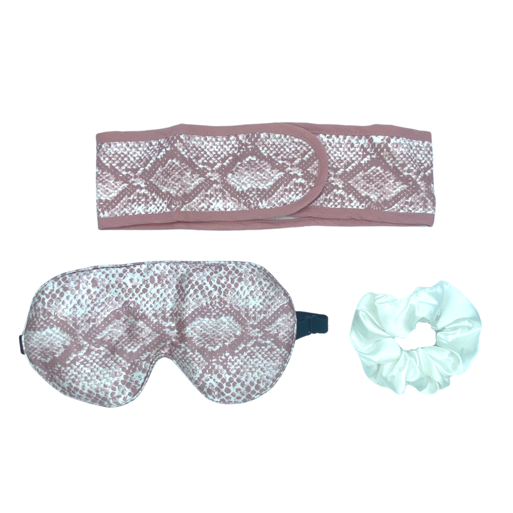 ¡Saluda con gusto a tu Posh Beauty Set para disfrutar de una combinación de poderes de satén y microfibra! Duerme bien y disfruta de un sueño reparador sabiendo que nuestra máscara de satén para dormir mantendrá tu piel nutrida y suave mientras duermes, y el coletero de satén evita las puntas abiertas y las roturas. Mejora tus días de spa con la diadema de microfibra para absorción durante las duchas y las sesiones de peinado. ¡Nuestra máscara para ojos también tiene una correa ajustable para un ajuste cómodo y nuestra diadema de microfibra tiene algunos trucos lindos con velcro y una abertura para cola de caballo!